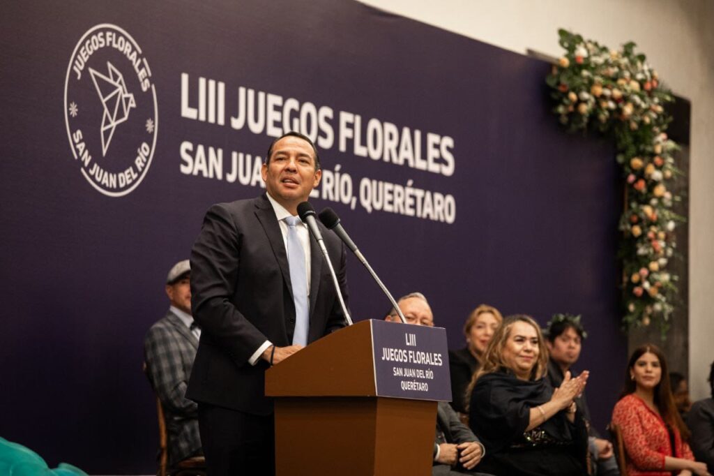 Los Juegos Florales son un símbolo vivo del espíritu de San Juan del Río, representan la riqueza del pensamiento de las y los sanjuanenses, sus ideas y el orgullo de sus raíces, afirmó el presidente municipal, Roberto Cabrera Valencia, durante la ceremonia con motivo de la edición LIII de los Juegos Florales, que este año también celebran 60 años de su fundación y que forman parte de las actividades de la Feria Nacional Ganadera San Juan del Río 2025.